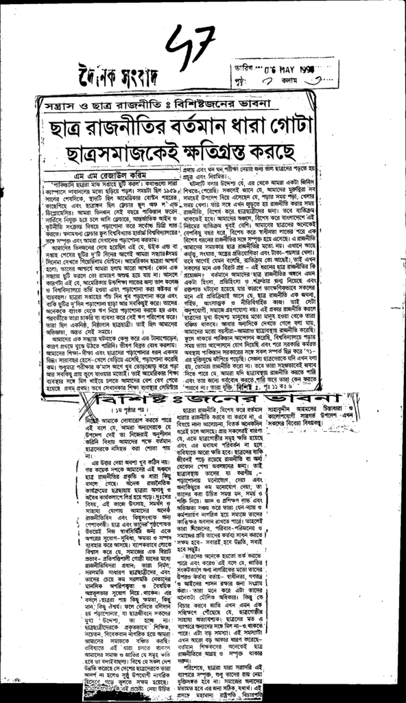সন্ত্রাস ও ছাত্র রাজনীতি : বিশিষ্ট জনের ভাবনা Published on Newspaper দৈনিক সংবাদ Category Student Politics Download
