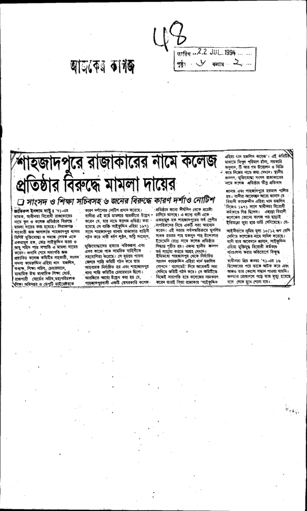শাহজাদপুরে রাজাকারের নামে কলেজ প্রতিষ্ঠার বিরুদ্ধে মামলা দায়ের Published on Newspaper দৈনিক আজকের কাগজ Category Public Examination Public Examination Others Download