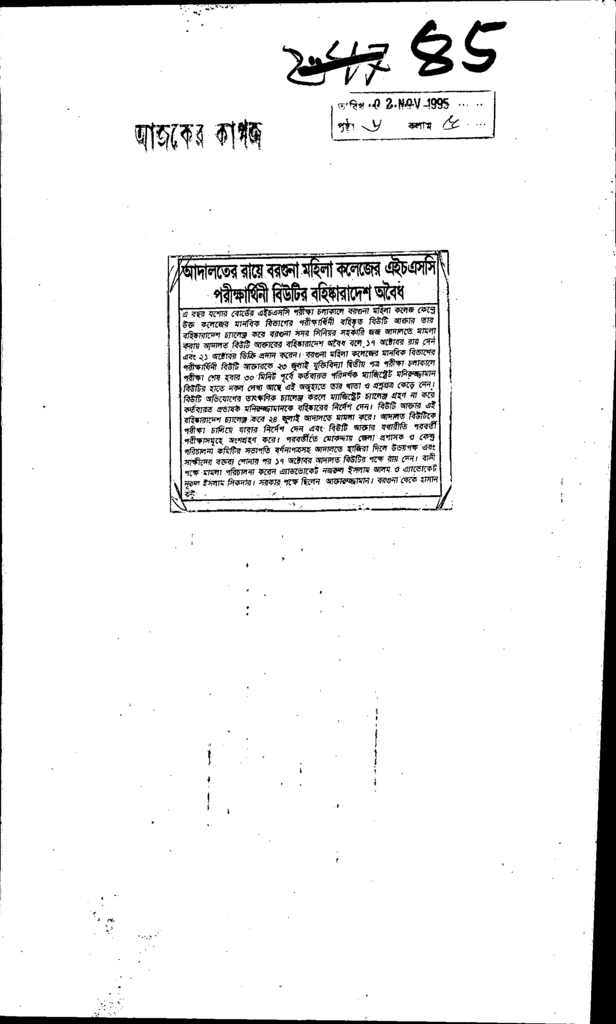 আদালতের রায়ে বরগুনা মহিলা কলেজের এইচএসসি পরীক্ষার্থিনী বিউটির বহিষ্কারাদেশ অবৈধ Published on Newspaper দৈনিক আজকের কাগজ Category Public Examination Public Examination Others Download