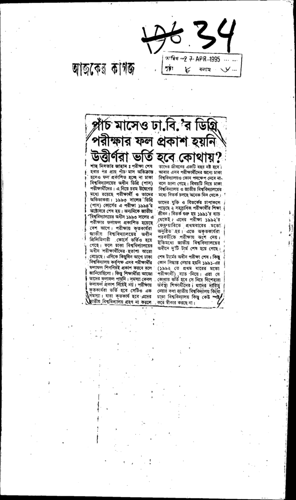 পাঁচ মাসেও ঢা.বি.’র ডিগ্রী পরীক্ষার ফল প্রকাশ হয়নি উত্তীর্ণরা ভর্তি হবে কোথায়? Published on Newspaper দৈনিক আজকের কাগজ Category Public Examination Public Examination Others Download