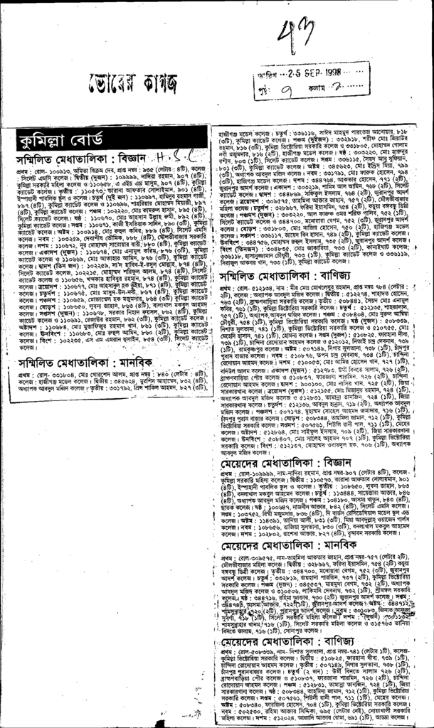 কুমিল্লা বোর্ড সম্মিলিত মেধাতালিকা : বিজ্ঞান Published on Newspaper দৈনিক ভোরের কাগজ Category Public Examination Public Examination Others Download
