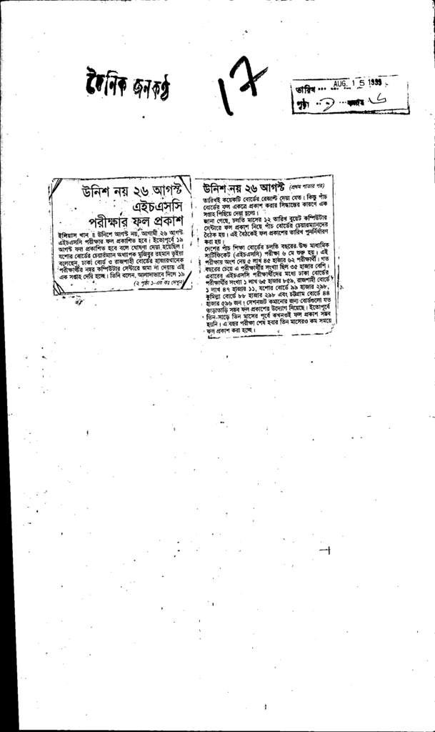 উনশি নয়২৬ আগস্ট এইচএসসি পরীক্ষার ফল প্রকাশ Published on Newspaper দৈনিক জনকণ্ঠ Category Public Examination Public Examination Others Download