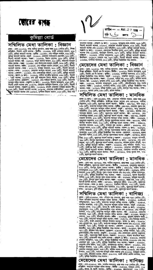 কুমিল্লা বোর্ড সম্মিলিত মেধা তালিকা: বিজ্ঞান Published on Newspaper দৈনিক ভোরের কাগজ Category Public Examination Public Examination Others Download
