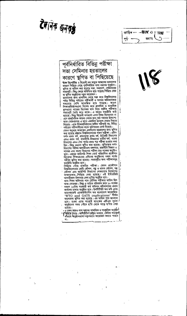 পূর্বনির্ধারিত বিভিন্ন পরীক্ষা সভা সেমিনার হরতালের কারণে স্থগিত বা পিছিয়েছে