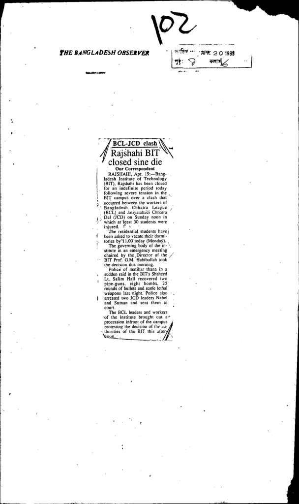 Bcl,jcd clash rashahi bit closed sine die Published on Newspaper The Bangladesh Observer Category Student Politics Download