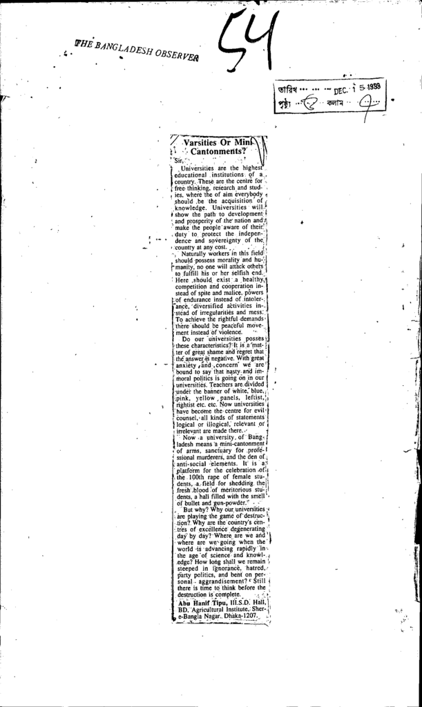 Varsities or mini cantonments Published on Newspaper The Bangladesh Observer Category Student Politics Download