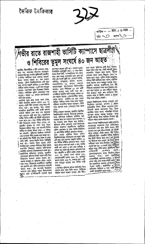 গভীর রাতে রাজশাহী ভার্সিটি ক্যাম্পাসে ছাত্রলীগ ও শিবিরের তুমুল সংঘর্ষে ৪০জন আহত Published on Newspaper দৈনিক ইনকিলাব Category Campus Terrorism Download