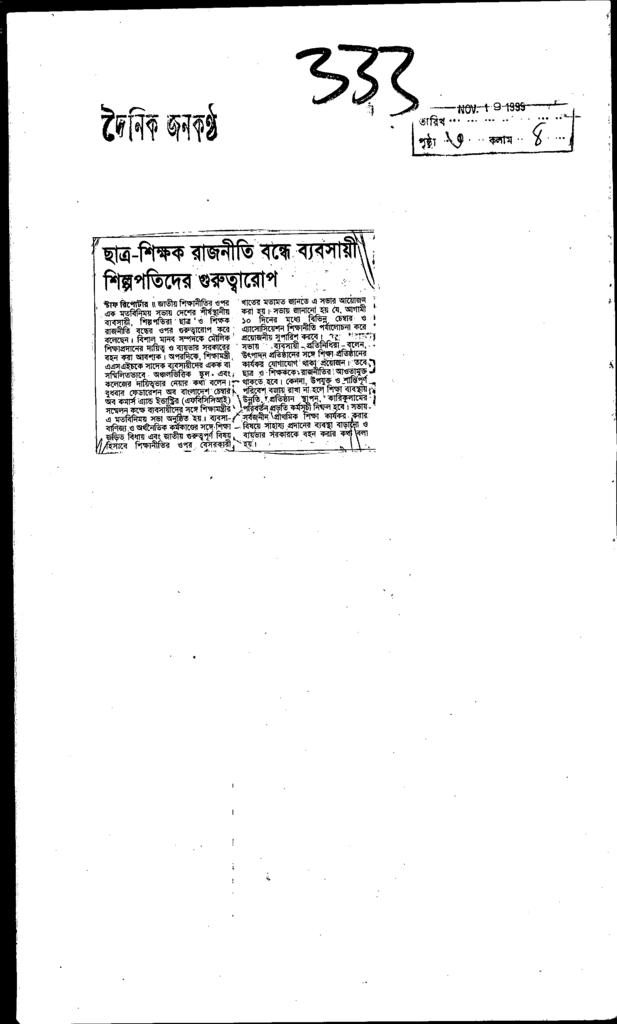 ছা্ত্র শিক্ষক রাজনতি বন্ধে ব্যবসায়ী শিল্পপতিদরে গুরুত্বারোপ Published on Newspaper দৈনিক জনকণ্ঠ Category Student Politics Download