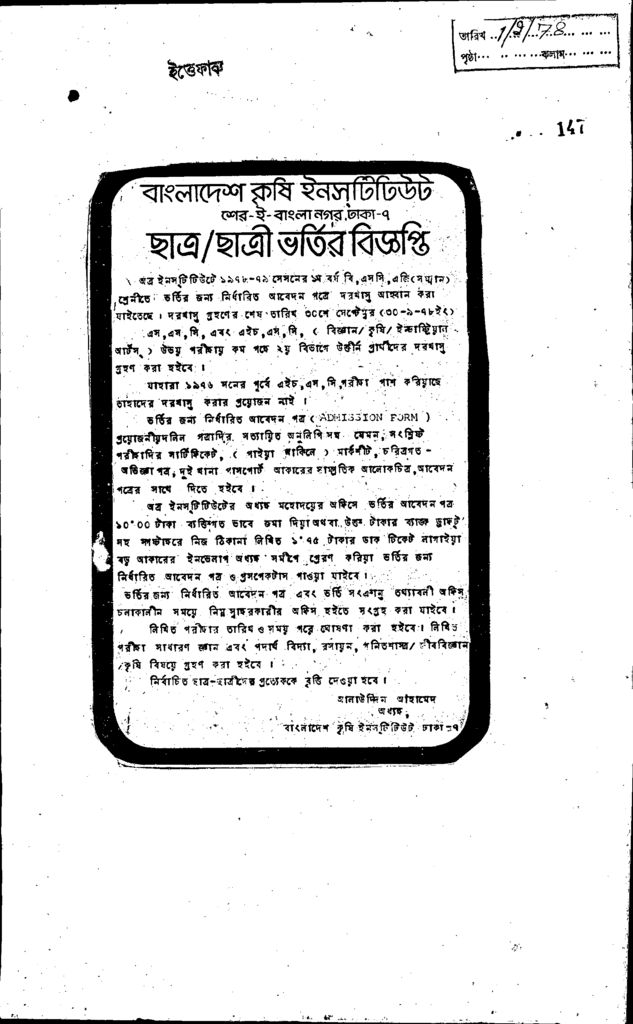 বাংলাদেশ কৃষি ইনসটিটিউট ছাত্র ছাত্রী ভর্তির বিঞ্জপ্তি