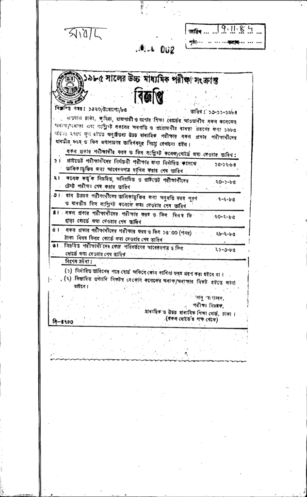 ১৯৮৫ সালে উচ্চ মাধ্যমিক পরীক্ষা সংক্রান্ত বিজ্ঞপ্তি Published on Newspaper দৈনিক সংবাদ Category General Education Download