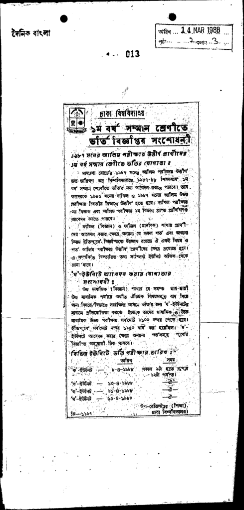 ঢাকা বিশ্ববিদ্যালয় ১ম বর্ষ সম্মান শ্রেনীতে ভর্তি বিজ্ঞপ্তিার সংশোধনী