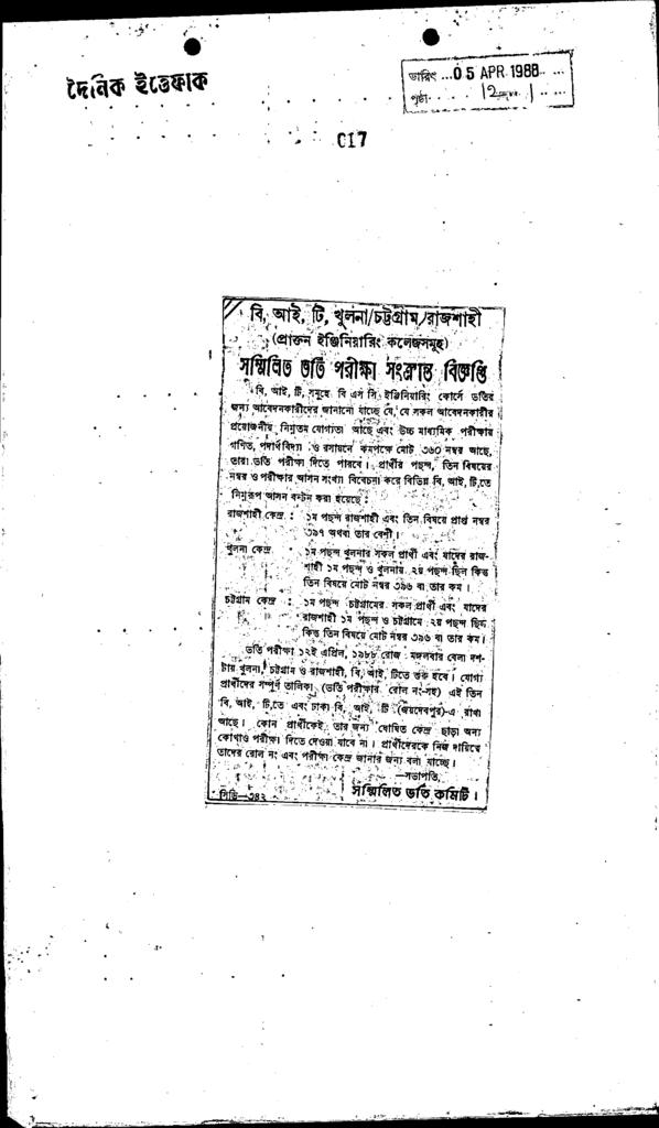 বি, আই টি খুলনা চট্রগ্রাম রাজশাহী Published on Newspaper দৈনিক ইত্তেফাক Category Admission / Seat Problem Download