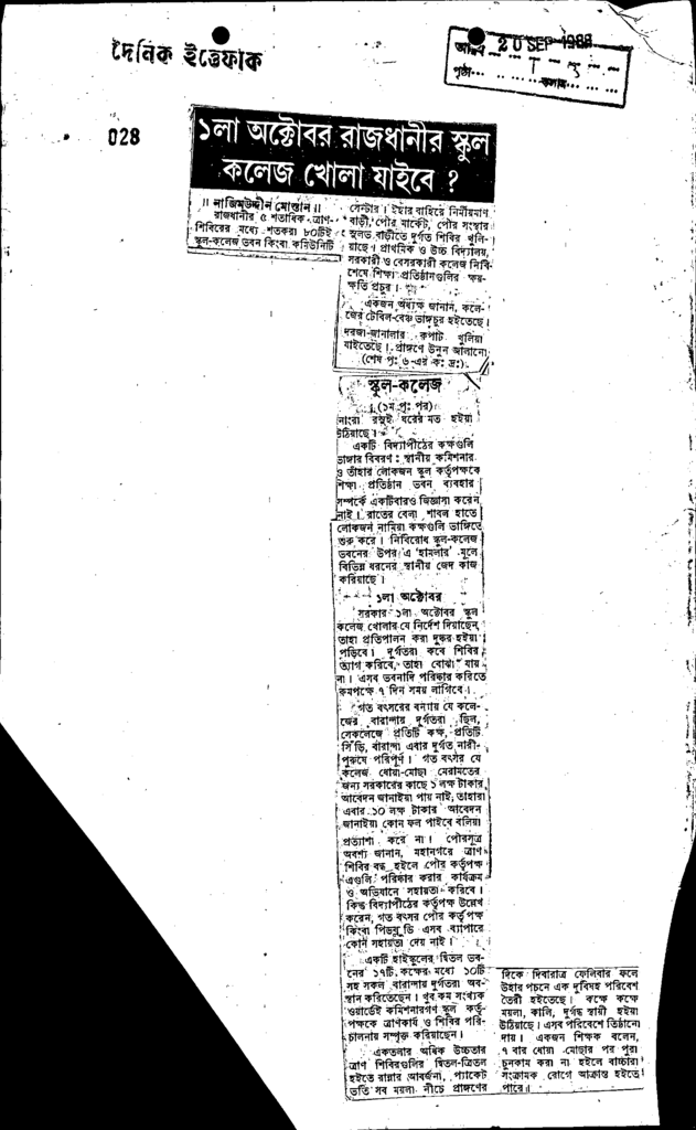 ১লা অক্টোবর রাজধানীর স্কুল কলেজ খো্লা যাইবে? Published on Newspaper দৈনিক ইত্তেফাক Category Admission / Seat Problem Download