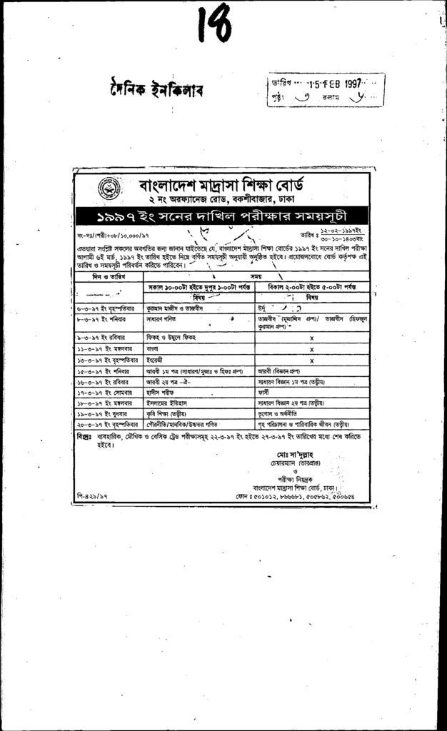 ১৯৯৭ইং সনের দাখিল পরীক্ষার সময়সূচী Published on Newspaper দৈনিক ইনকিলাব Category Madrasah Education Download