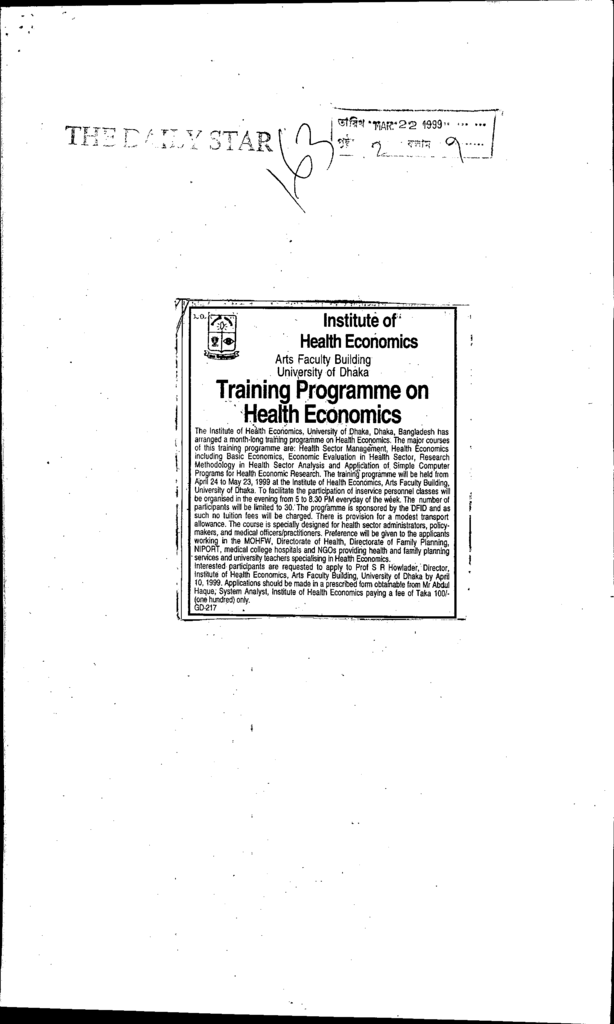 Training Programme on Health Economics Published on Newspaper The Daily Star Category Professional Education Professional Education Medical Download