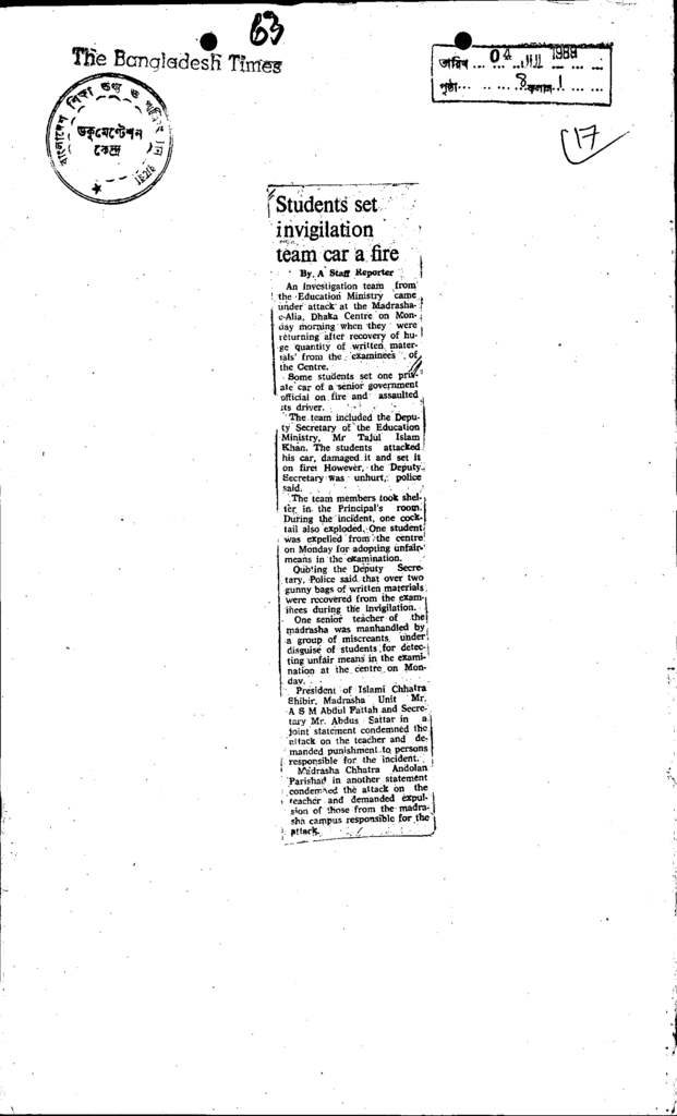 Students set invigilation team car a fire Published on Newspaper The Bangladesh Times Category Madrasah Education Madrasah Education Alia Download
