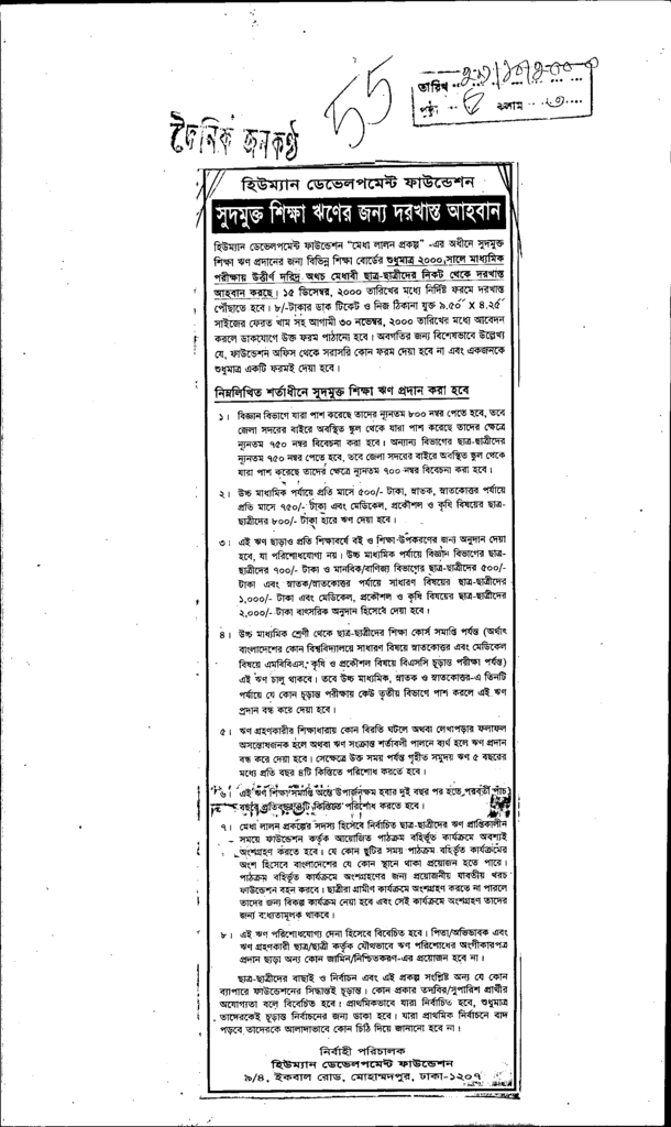 সুদমুক্ত শিক্ষা ঝণের জন্য দরকাস্ত আহ্বান Published on Newspaper দৈনিক জনকণ্ঠ Category Others Download
