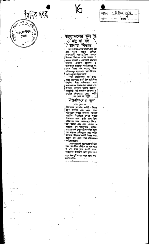 উত্তরাঞ্চলের স্কুল ও মাদ্রাসা বন্ধ রাখার সিদ্ধান্ত Published on Newspaper দৈনিক খবর Category Admission / Seat Problem Admission/Seat Problem Download