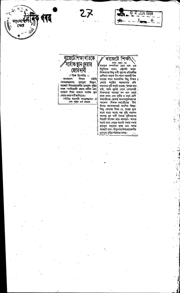 বাজেটে শিক্ষা খাতকে সর্বোচ্চ স্থান দেয়ার জোর দাবী Published on Newspaper দৈনিক খবর Category Admission / Seat Problem Admission/Seat Problem Download