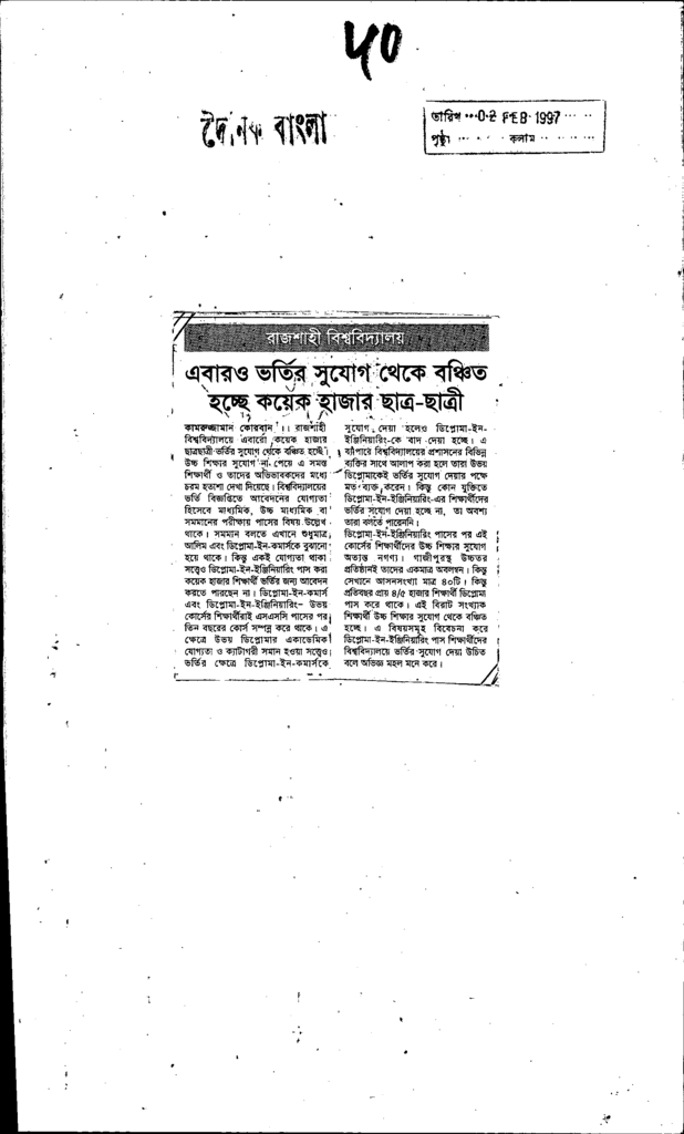 এবারও ভর্তির ভর্তির সুযোগ থেকে ভঞ্চিত হছ্চে কয়েক হাজার হাজার ছাত্র -ছাত্রী Published on Newspaper দৈনিক বাংলা Category Admission / Seat Problem Admission/Seat Problem Download