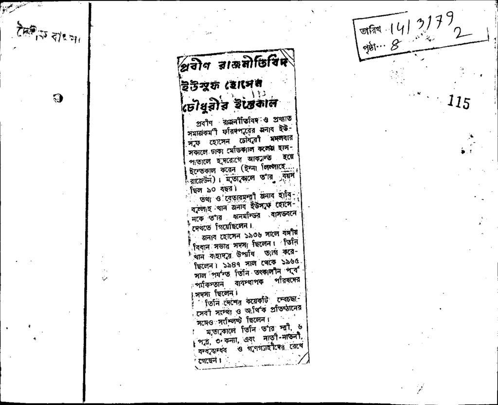 প্রবীণ রাজনীতিবিদ ইউসুফ হোসেন চৌধুরীর ইন্তেকাল Published on Newspaper দৈনিক বাংলা Category General Education Download