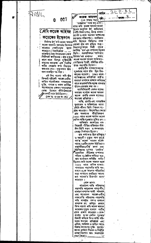 কবি ফয়েজ আহমদ ফয়েজের ইন্তেকাল