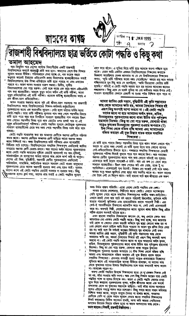 রাজশাহী বিশ্ববিদ্যালয়ে ছাত্র ভর্তিতে কোটা পদ্ধতি ও কিছু কথা Published on Newspaper দৈনিক আজকের কাগজ Category Admission / Seat Problem Admission/Seat Problem Download