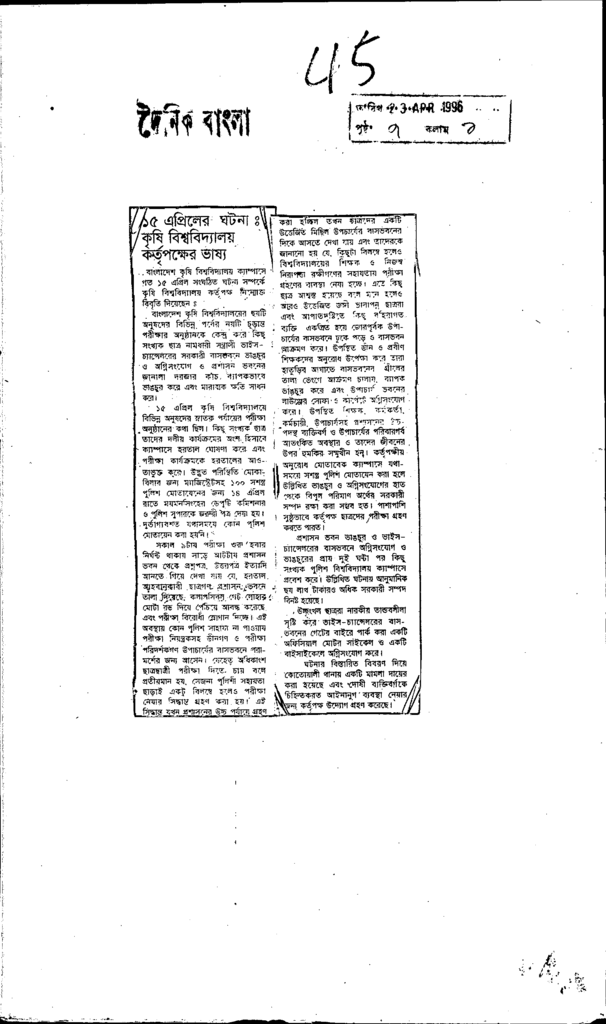 ১৫ এপ্রিলের ঘটনাঃ কৃষি বিশ্ববিদ্যালয় কর্তৃপক্ষের ভাষ্য Published on Newspaper দৈনিক বাংলা Category General Education General Education Higher Education Public Download