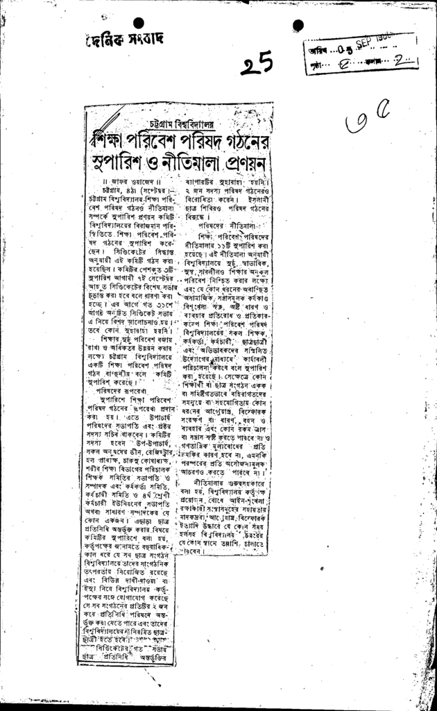 শিক্ষা পরিবেশ পরিষদ গঠনের সুপারিশ ও নীতিমালা প্রণয়ন Published on Newspaper দৈনিক সংবাদ Category General Education General Education Higher Education Public Download