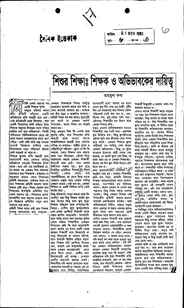 শিশুর শিক্ষাঃ শিক্ষক ও অবিভাবকের দায়িত্ব Published on Newspaper দৈনিক ইত্তেফাক Category Child Education Download