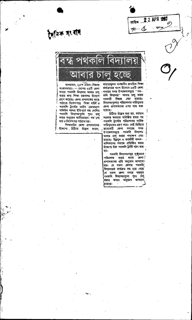 বন্ধপথকলি বিদ্যালয় আবার চালু হচ্ছে Published on Newspaper দৈনিক সংবাদ Category Child Education Download