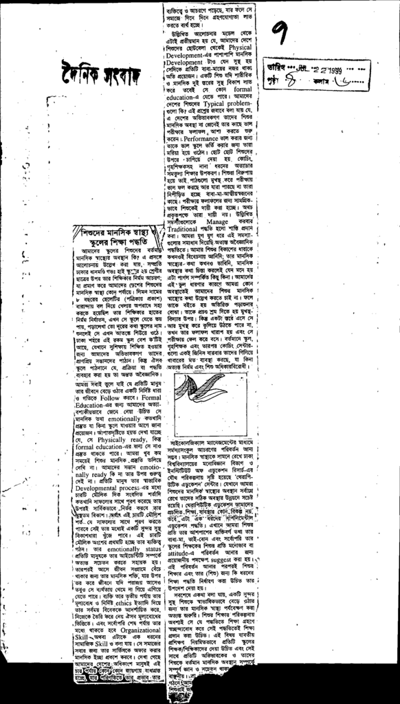 শিশুদের মানসিক স্বস্থ্য স্কুলের শিক্সা পদ্ধতি Published on Newspaper দৈনিক সংবাদ Category Child Education Download