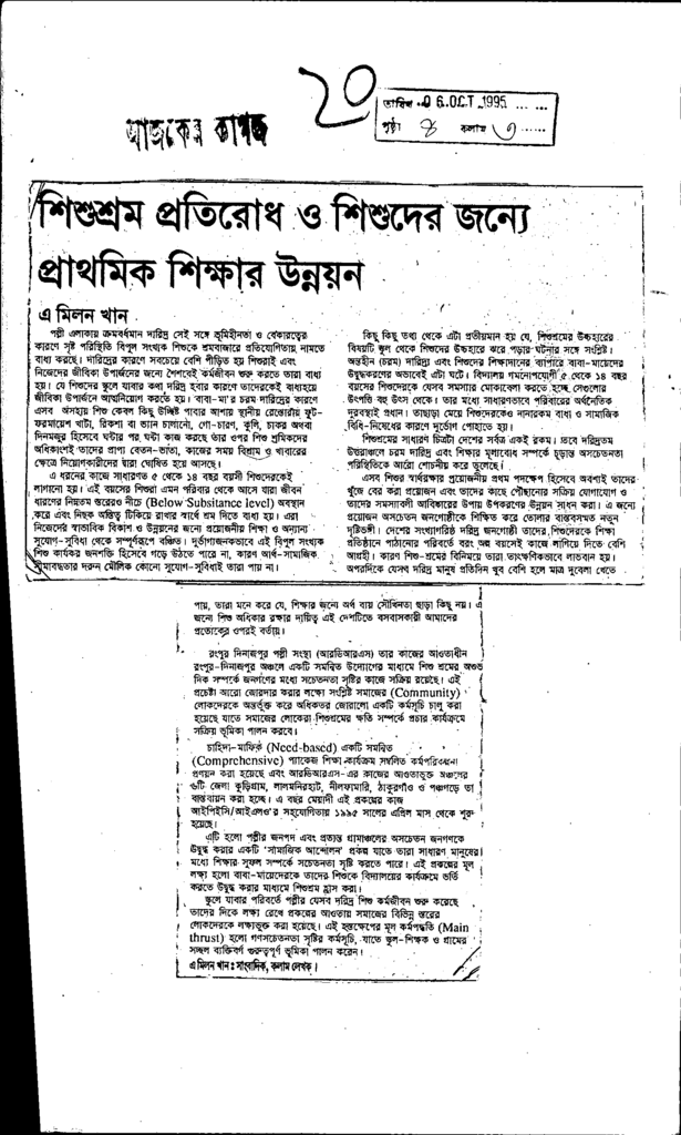 শিশুশ্রম প্রতিরোধ ও শিশুদের জন্যে প্রাথমিক শিক্ষার উন্নয়ন Published on Newspaper দৈনিক আজকের কাগজ Category Child Education Download