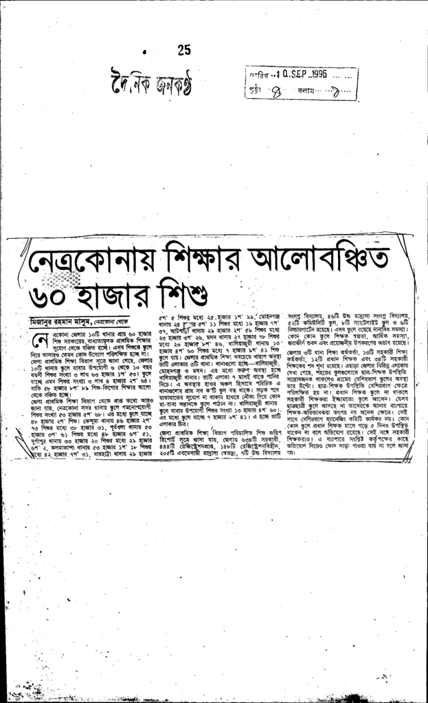 নেত্রকোনায় শিক্ষার আলোবঞ্চিত ৬০ হাজার শিশু Published on Newspaper দৈনিক জনকণ্ঠ Category Child Education Download