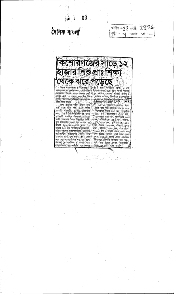 সিশোরগঞ্জের সাড়ি ১২৩ হাজার শিশু প্রাঃ শিক্ষা থেকে ঝরে পড়েছে Published on Newspaper দৈনিক বাংলা Category Child Education Download