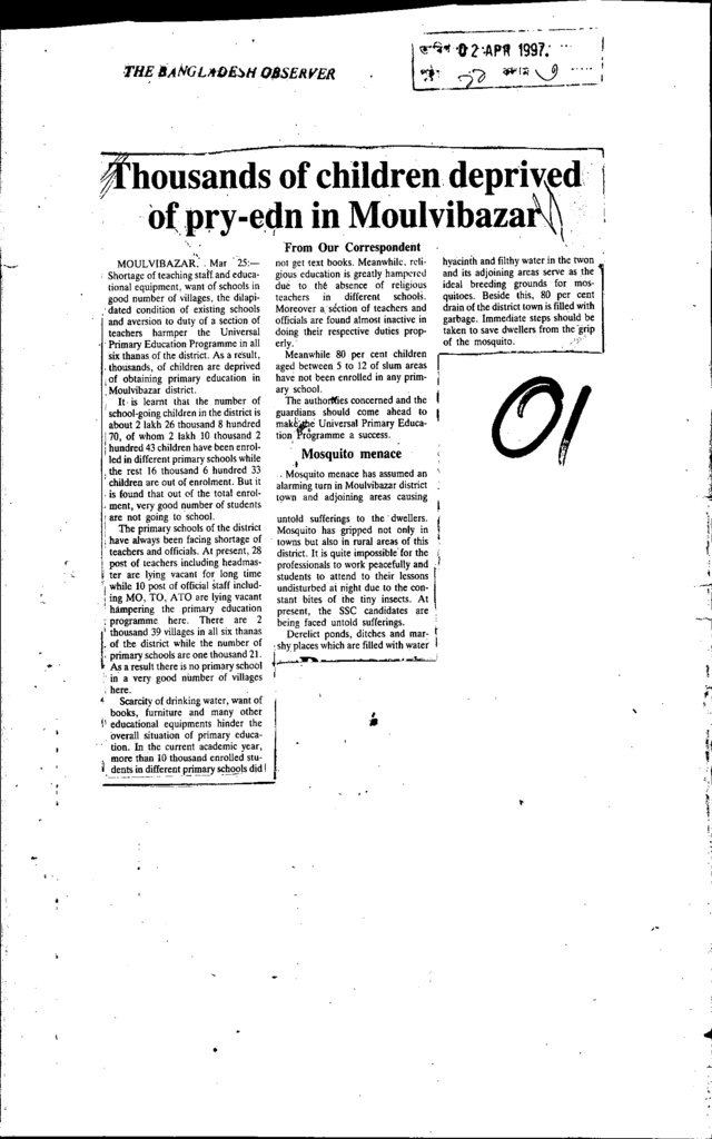 Thousands of children deprived of pry - edn in moulvibazar Published on Newspaper The Bangladesh Observer Category Child Education Download