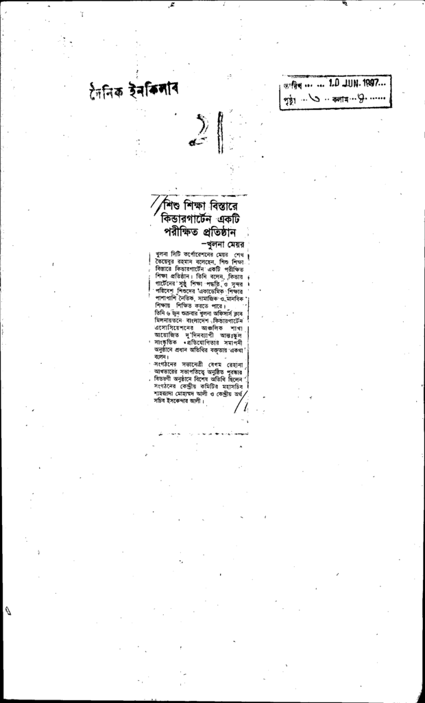 শিশু শিক্ষা বিস্তারে কিন্ডরগার্টেন একটি পরীক্ষিতপ্রতিষ্টান Published on Newspaper দৈনিক ইনকিলাব Category Child Education Download