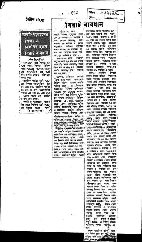 নারী -পুরুষের শিক্ষা ও চাকরির হারে বিরাট ব্যবধান Published on Newspaper দৈনিক বাংলা Category Educational Survey Download