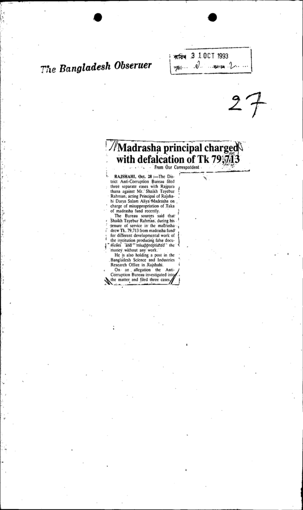 Madrasha principal charged with deflcation of tk 79,713 Published on Newspaper The Bangladesh Observer Category Madrasah Education Madrasah Education Alia Download