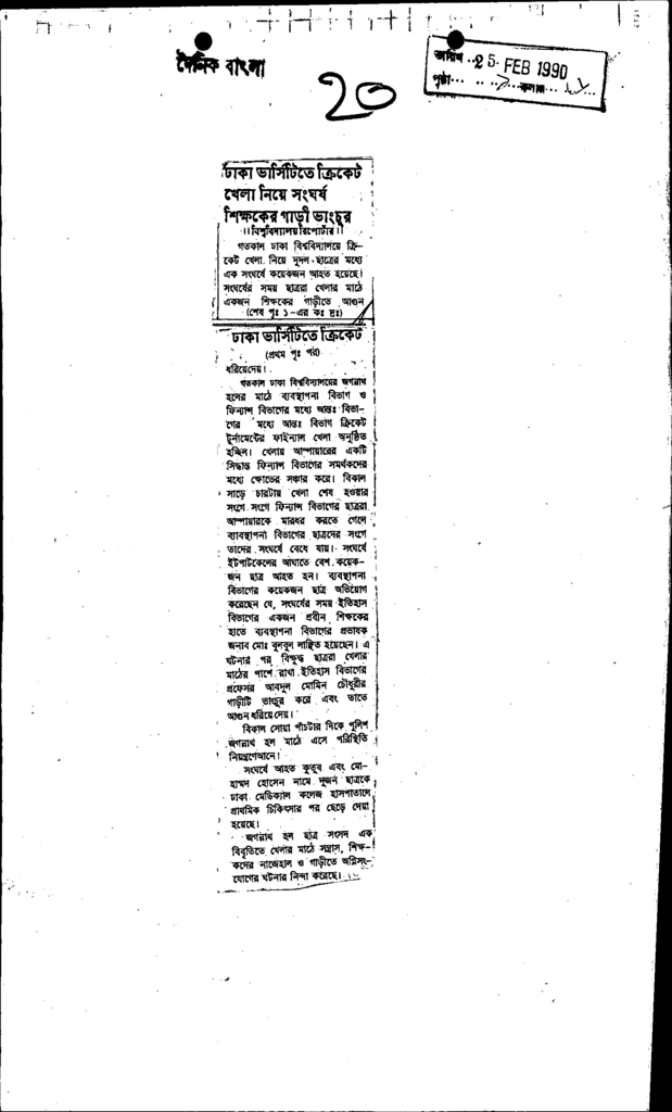 ঢাকা ভার্সিটিতে ক্রিকেট খেলা নিয়ে সংঘর্ষ শিক্ষকের গাড়ী ভাংচুর Published on Newspaper দৈনিক বাংলা Category General Education General Education Higher Education Public Download