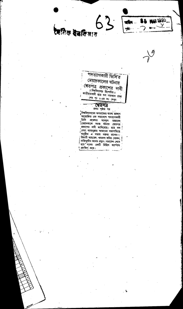 পদত্যাগকারী ভিসির মেয়াদকালের ঘটনার শ্বেতপত্র প্রকাশের দাবী Published on Newspaper দৈনিক ইনকিলাব Category General Education General Education Higher Education Public Download