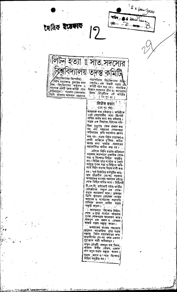 লিটন হত্যা!! সাত সদস্যের বিশ্ববিদ্যালয় তদন্ত কমিটি Published on Newspaper দৈনিক ইত্তেফাক Category General Education General Education Higher Education Public Download