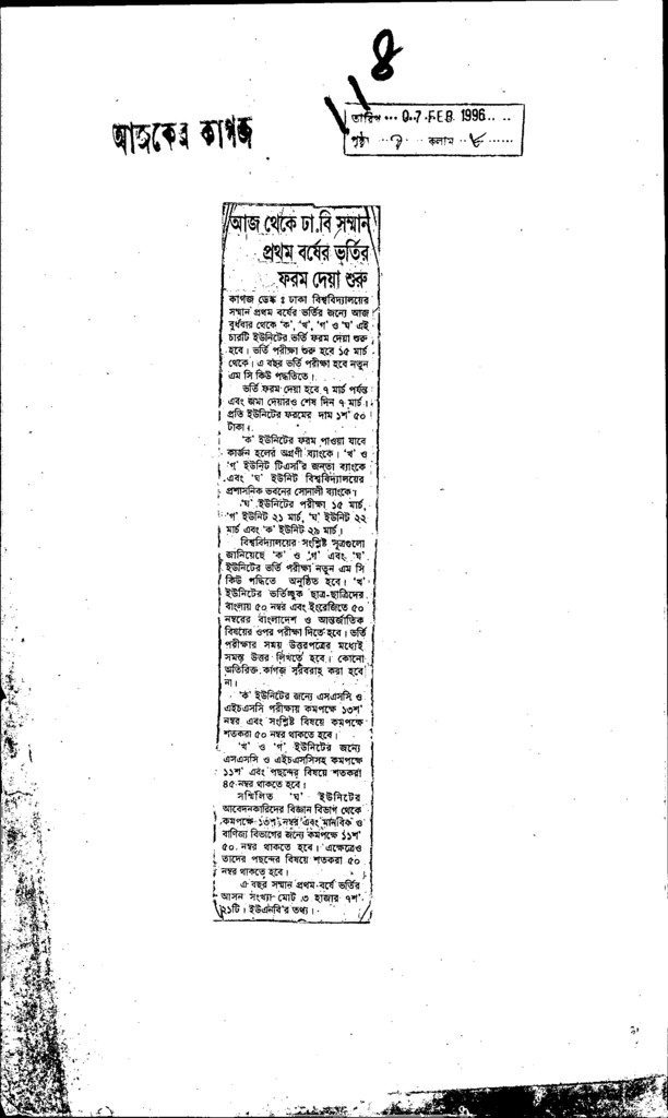 আজ থেকে ঢা.বি. সম্মান প্রথম বর্ষের ভর্তির ফরম দেয়া শুরু Published on Newspaper দৈনিক আজকের কাগজ Category General Education General Education Higher Education Public Download