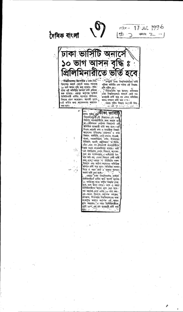 ঢাকা ভার্সিটি অনার্সে 10 ভাগ আসন বৃদ্ধিঃ প্রিলিমিনারীতে ভর্তি হবে Published on Newspaper দৈনিক বাংলা Category General Education General Education Higher Education Public Download
