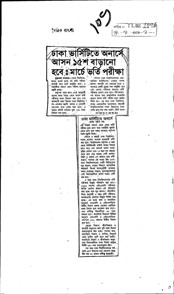 ঢাকা ভার্সিটিতে অনার্সে আসন 15শ বাড়ানো হবেঃ মার্চে ভর্তি পরীক্ষা Published on Newspaper দৈনিক বাংলা Category General Education General Education Higher Education Public Download