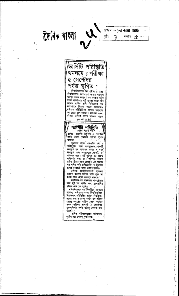 ভার্সিটি পরিস্থিতি থমথমেঃ পরীক্ষা 5 সেপ্টেম্বর পর্যন্ত স্থগিত Published on Newspaper দৈনিক বাংলা Category General Education General Education Higher Education Public Download