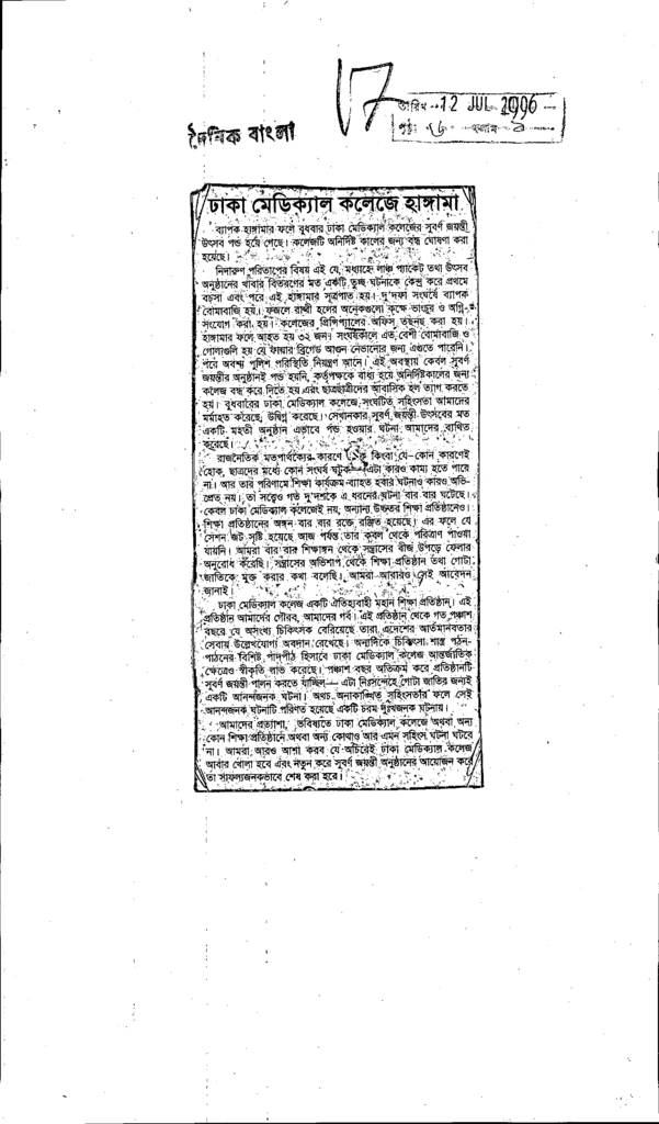 ঢাকা মেডিক্যাল কলেজে হাঙ্গামা Published on Newspaper দৈনিক বাংলা Category Madrasah Education Madrasah Education Alia Download