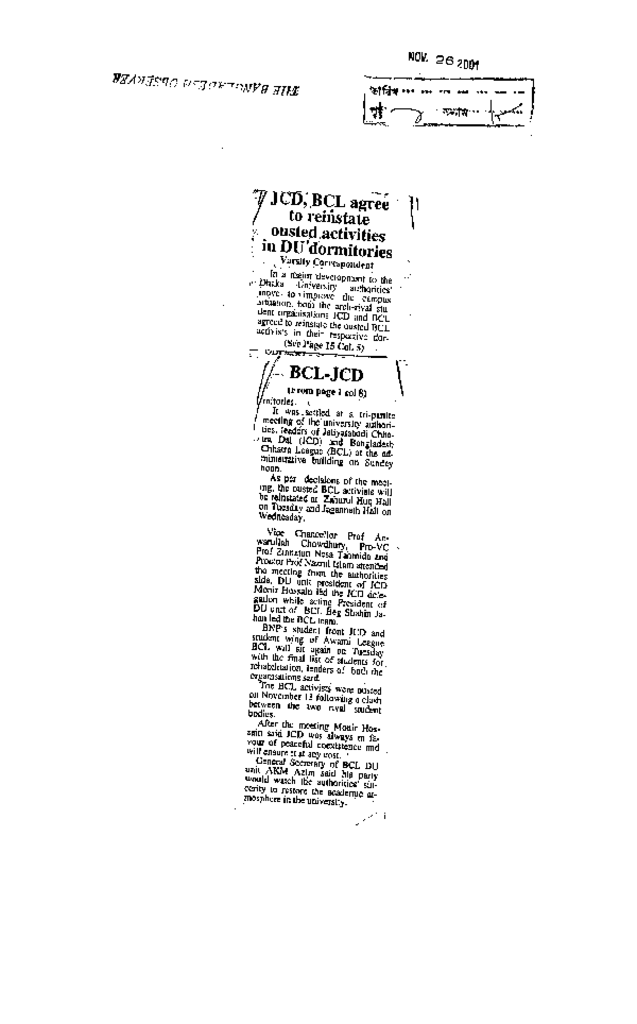 JCD, BCL agree to reinstate ousted activities in DU dormitories Published on Newspaper The Bangladesh Observer Category Student Politics Download
