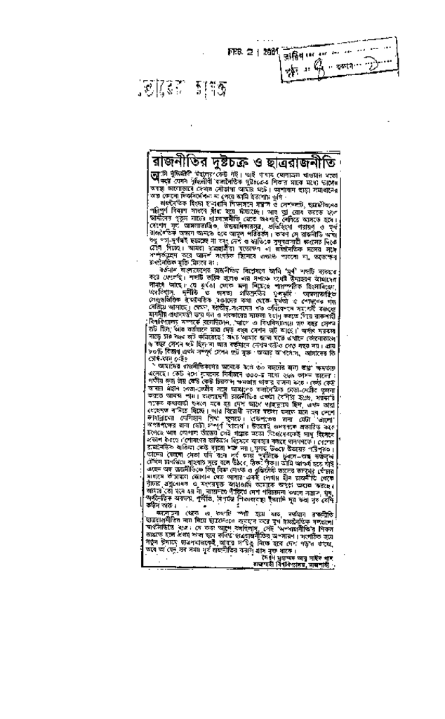 রাজনীতির দুষ্টচক্র ও ছাত্ররাজনীতি Published on Newspaper দৈনিক ভোরের কাগজ Category Student Politics Download