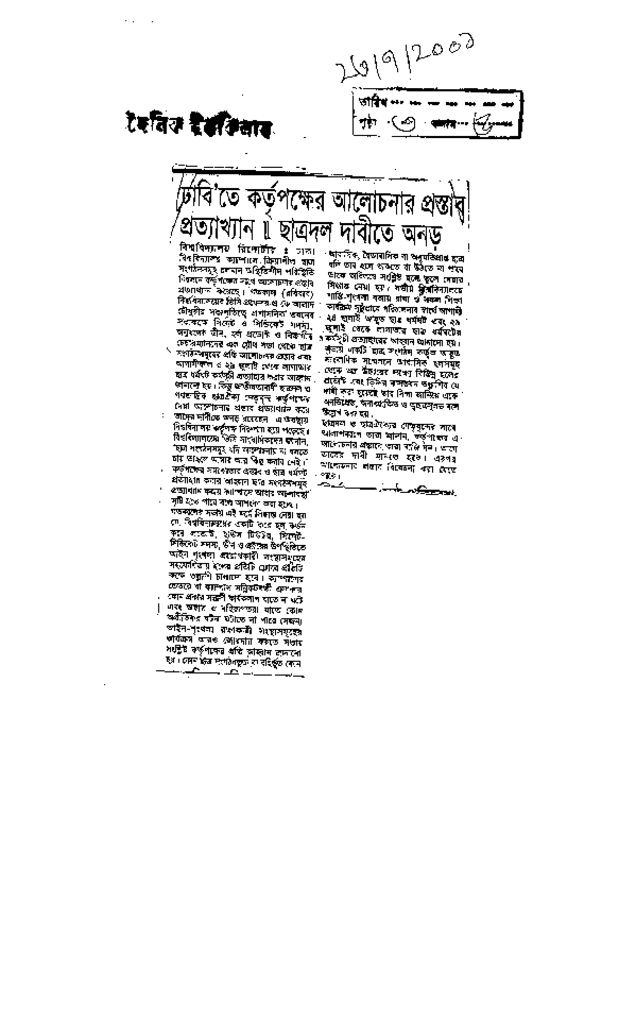 ঢাবিতে কর্তৃপক্ষের আলোচনার প্রস্তাব প্রত্যাখ্যান, ছাত্রদল দাবীতে অনড় Published on Newspaper দৈনিক ইত্তেফাক Category Student Politics Download